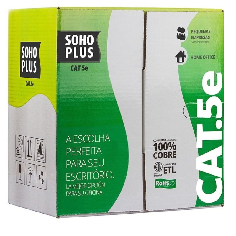 - Construção: U/UTP – 4 pares trançados compostos de condutores sólidos de cobre nu, 24 AWG, isolados em polietileno especial